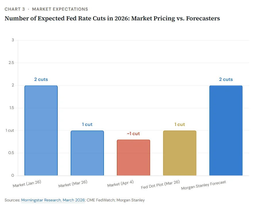 Morgan Stanley’s base case depends on one condition: long-run inflation expectations must remain anchored. A sustained rise would force the Fed to hold rates higher for longer. Morningstar’s senior U.S. economist Preston Caldwell warns that the current oil shock is large enough to justify a firm Fed stance, even amid a softening labor market. If oil prices fail to retreat, second-round effects on wages and services become a real concern.