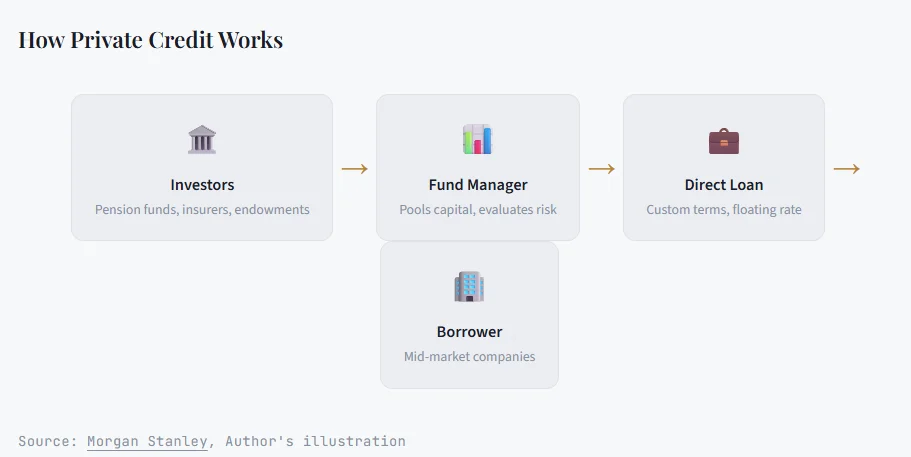 Private credit is lending that happens outside traditional banks. Instead of going through public markets or a bank, borrowers deal directly with specialized lenders, such as investment firms, pension funds, or insurance companies. The loans are privately negotiated, not traded on stock exchanges, and tailored to the borrower’s needs.