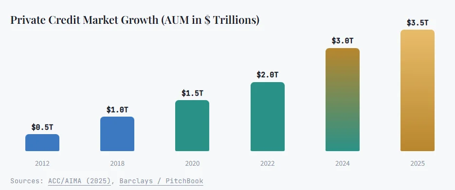 After the 2008 financial crisis, tighter rules (known as Basel III) forced banks to hold more reserves and lend less, especially to mid-sized firms. Private credit stepped into that gap. The market has grown from under $500 billion in 2012 to $3.5 trillion in AUM by late 2025, according to research from the Alternative Credit Council (ACC).
