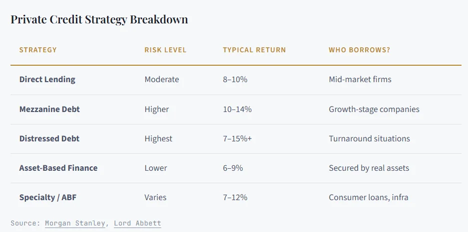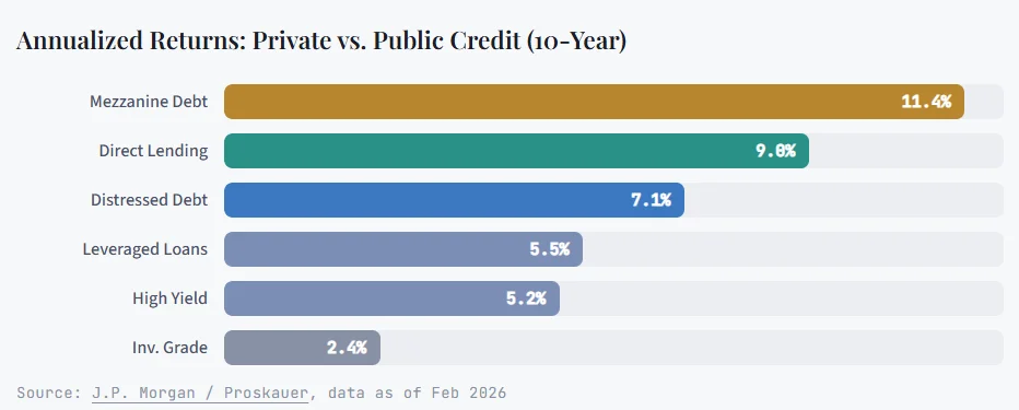 The big draw is yield. According to J.P. Morgan data (as of February 2026), direct lending returned an annualised 9.0% over the past decade, compared to 5.2% for high-yield bonds and just 2.4% for investment-grade corporate debt. That premium compensates investors for giving up liquidity.