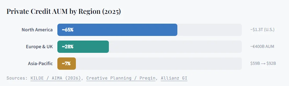 Private credit is no longer just a U.S. story. The United States still dominates, holding roughly 65% of global AUM. But Europe and the Asia-Pacific are catching up fast. In the first nine months of 2025, European funds captured 35% of all private debt fundraising, up from 24% the year before. Many analysts see this as a lasting structural shift, not a one-off spike.