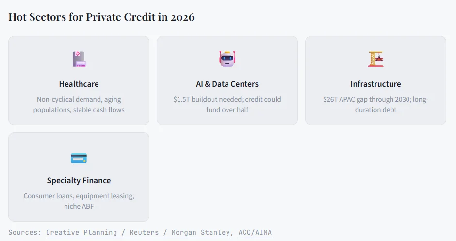 AI infrastructure, healthcare, and specialty finance are emerging as the hottest sectors for private credit deployment in 2026.