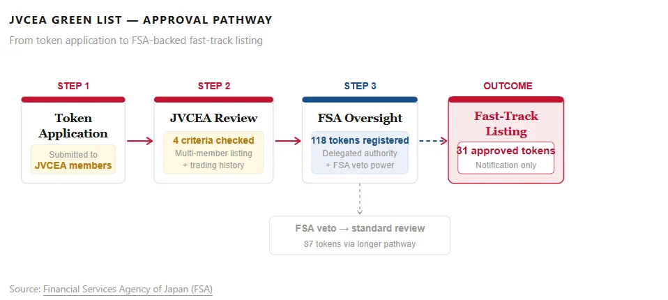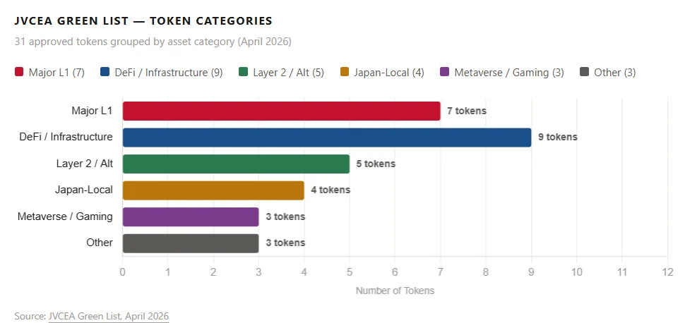 Japan’s JVCEA Green List covers 31 tokens as of April 2, 2026, fast-tracked via FSA delegated authority, bypassing lengthy individual reviews.