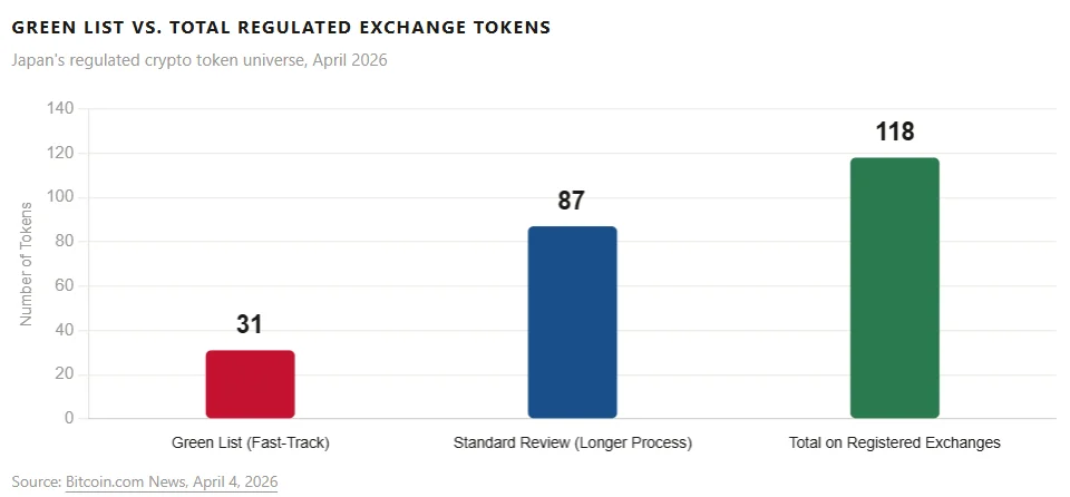 Of the 118 tokens available on registered Japanese exchanges, only 31 (26%) hold Green List status, signaling the highest tier of regulatory credibility.
