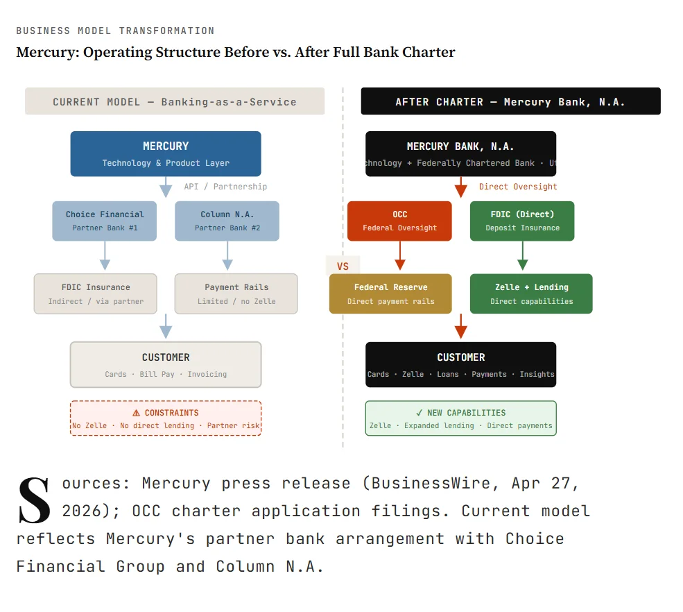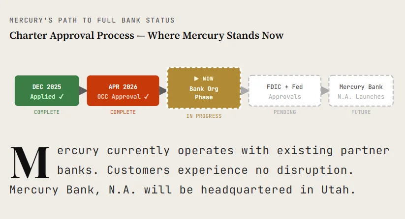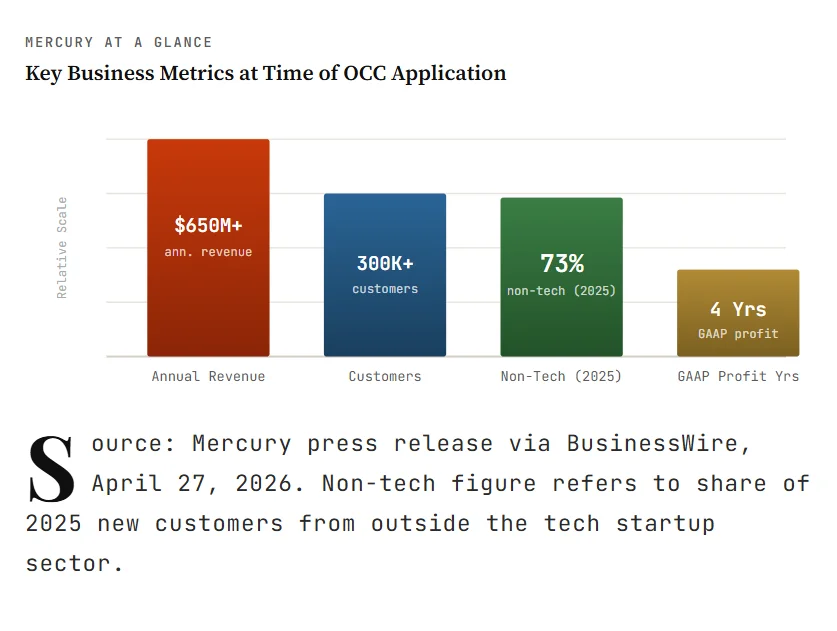 April 29, 2026 – With conditional OCC approval secured, Mercury moves toward becoming a full national bank. Its $650M revenue and 300,000+ customers make it one of the most credible fintech charter applicants in history.