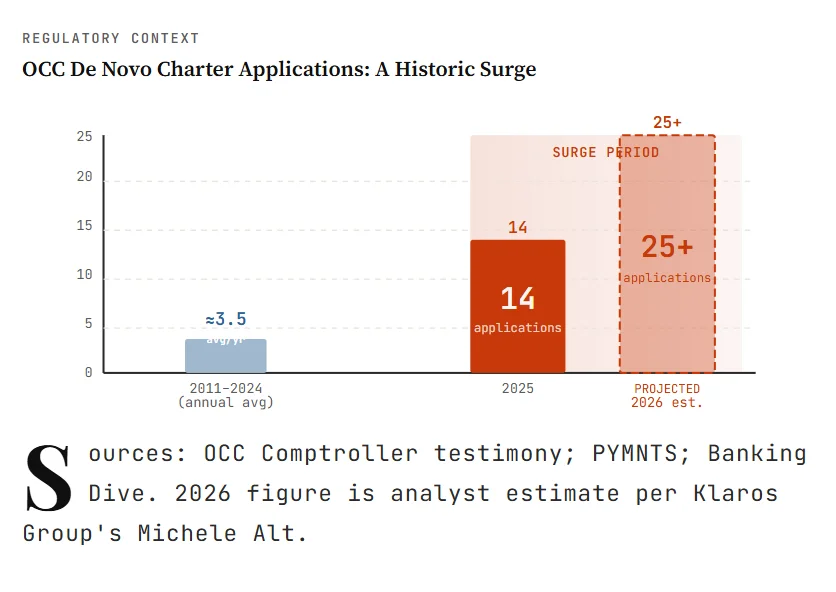Mercury’s approval does not exist in isolation. The OCC received 14 de novo applications in 2025 alone, nearly matching the combined total from the prior four years. Before 2025, the OCC averaged fewer than four applications per year from 2011 to 2024. A regulatory reset is underway.