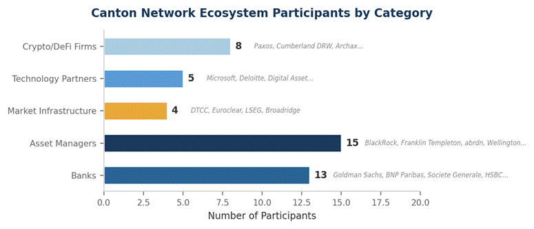 Canton was launched in 2023 by a consortium of over 30 financial institutions. Key participants include Goldman Sachs, BNP Paribas, DTCC, Euroclear, and HSBC. The network now has nearly 400 ecosystem participants and over 600 active validator nodes.