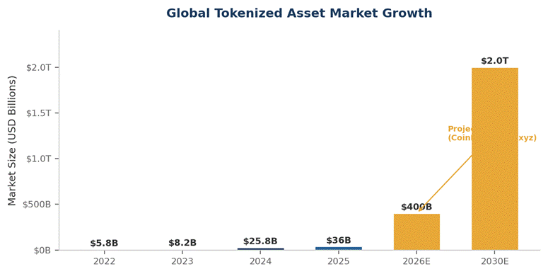 The tokenised asset market almost quadrupled in 2025. It reached nearly $20 billion by year-end, according to data from RWA.xyz. Industry projections suggest it could top $400 billion by the end of 2026.