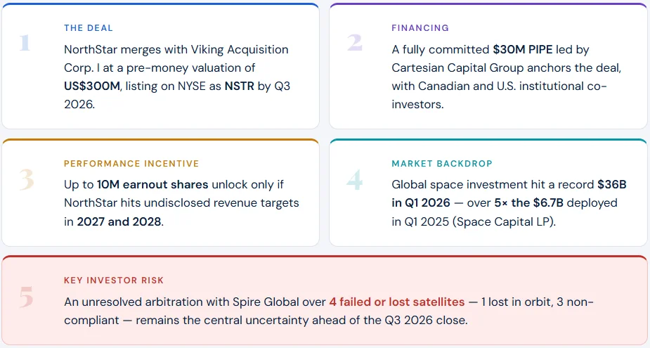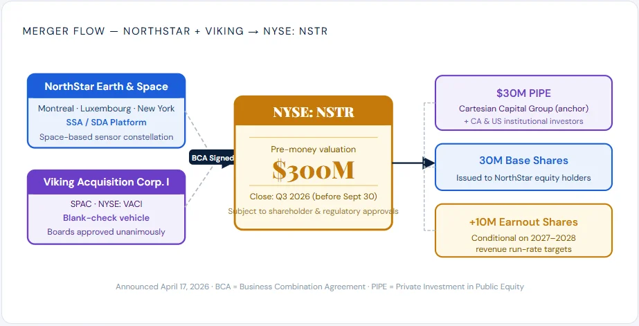 April 23, 2026 – Montreal-based NorthStar Earth & Space plans to merge with Viking Acquisition Corp. I. The deal targets a $300 million NYSE listing under ticker NSTR. But a troubled satellite history casts a long shadow.