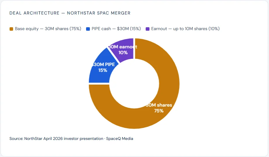 The transaction is straightforward on paper. According to SpaceNews, NorthStar’s equity holders receive 30 million shares at the $300 million pre-money valuation. A committed $30 million PIPE anchors the financing. New York private-equity firm Cartesian Capital Group leads the PIPE. Canadian and U.S. institutional investors also participate.
