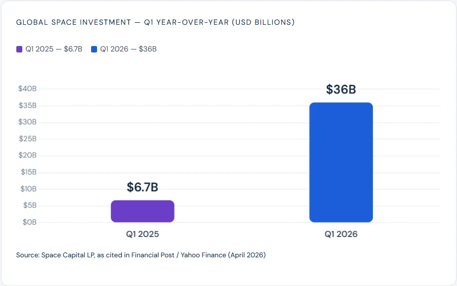 The timing of this deal is no accident. Space investment is exploding globally. According to venture-capital firm Space Capital LP, investors poured a record US$36 billion into space companies in Q1 2026. That compares to just US$6.7 billion in Q1 2025, a more than fivefold increase in one year.