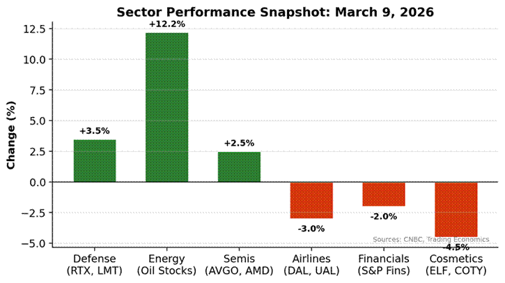March 10, 2026 – The Dow lost 350 points on Monday. WTI crude posted its biggest weekly gain since futures trading began. Defense stocks rose while airlines and financials tumbled.