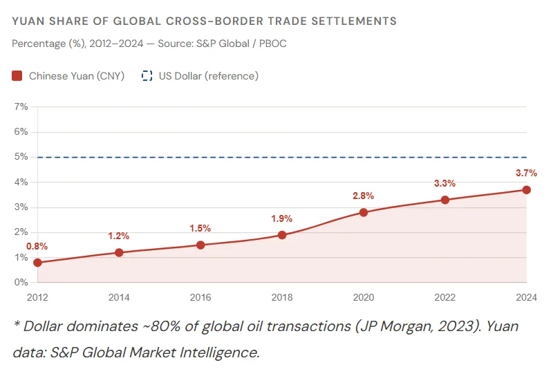 Yuan trade share rose from under 1% in 2012 to 3.7% in 2024, with 30% of China’s $6.2T trade now yuan-settled.