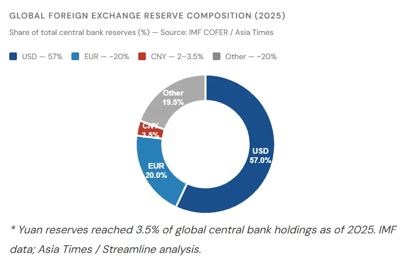 The dollar remains dominant at 57% of global reserves; the yuan holds just 2–3.5%, but the direction of change is unmistakable.