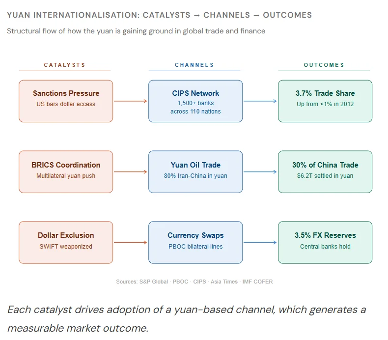 The yuan’s expansion follows a three-stage architecture. External pressure forces countries to seek dollar alternatives. Purpose-built channels move value in yuan. The result is measurable shifts in the data.