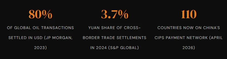 The practical result: sanctioned economies can move money without touching US-controlled rails. Iran reportedly conducts over 80% of its oil trade with China in yuan. That figure would have seemed impossible five years ago.