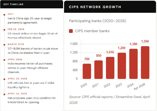 Iran and China do not rely on Western financial infrastructure. They use the Cross-Border Interbank Payment System, CIPS. Beijing built it as an alternative to the SWIFT network. It now spans over 1,500 banks across 110 countries, as of April 2026. Daily transaction volume has tripled since 2024.