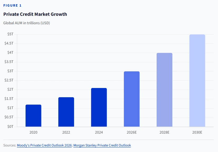 Despite the turbulence, the asset class continues to expand. Moody’s forecasts AUM exceeding $2 trillion in 2026 alone. The market could approach $4 trillion by 2030 and $5 trillion by 2029, per Morgan Stanley.