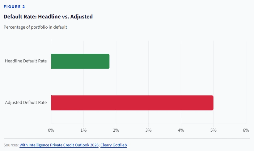 The headline default rate in private credit has stayed below 2% for years. That figure is misleading. Once selective defaults and restructuring exercises are included, the adjusted rate approaches 5%.