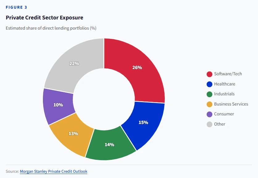 Software companies make up the largest sector exposure in private credit. Morgan Stanley estimates direct lending’s software allocation at roughly 26%. Apollo’s Debt Solutions BDC holds over 12% in software alone.