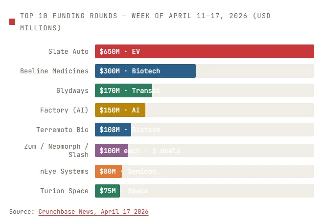 April 18, 2026 – Slate Auto’s $650M Series C tops the biggest deals week ending April 17, 2026. Transportation and life sciences command over 80% of capital deployed.
