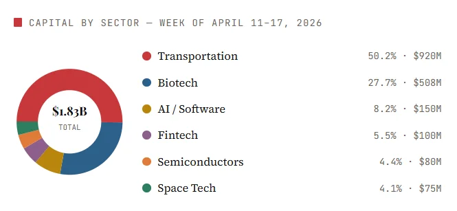 Venture capital had a striking week. U.S. startups raised $1.83 billion across ten major rounds between April 11–17, 2026. According to Crunchbase News, transportation and biotech dominated the leaderboard. Together, these two sectors claimed over $1.4 billion, roughly 78% of total capital.