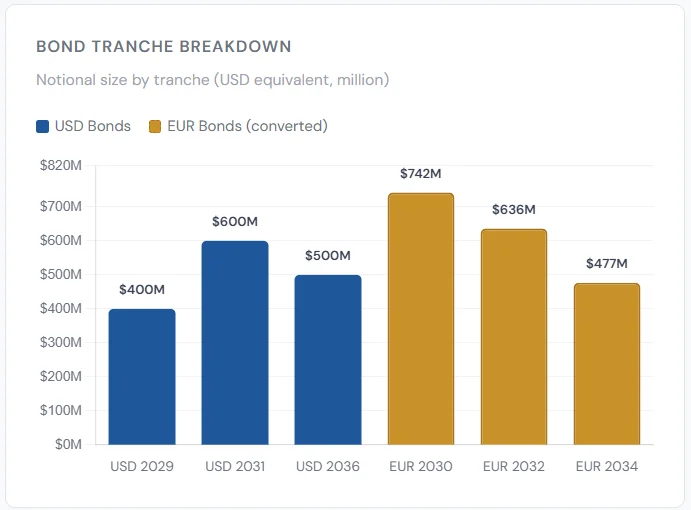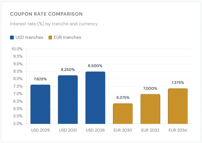 The euro portion also covers three maturities. It includes €700M due in 2030, €600M due in 2032, and €450M due in 2034. Euro coupons are set at 6.375%, 7.0%, and 7.375%.