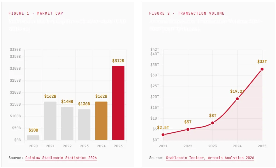 The ABA’s core argument centers on market size. The stablecoin market currently stands at roughly $312 billion, with transaction volumes expected to hit $33 trillion in 2025, a 72% year-on-year surge. That is large. But it is not yet the threat level the ABA fears.
