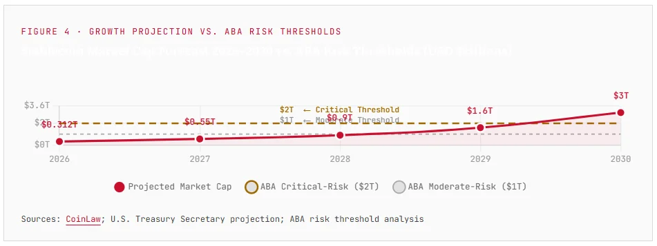 The contested risk is a stablecoin market scaling from $312B to $2 trillion, not today’s baseline.