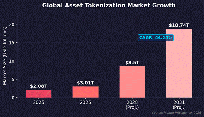 Trade finance tokenisation is moving from the pilot stage to production in 2026. The global asset tokenisation market hit $2.08 trillion in 2025. Analysts project it will reach $18.74 trillion by 2031. That represents a compound annual growth rate (CAGR) of 44.25%.