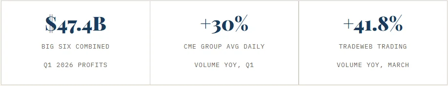 Volatility was the catalyst. The US-Iran war, energy price spikes, and Fed uncertainty drove trading volume to record highs across CME Group (+30% YoY) and Tradeweb (+41.8% YoY).
