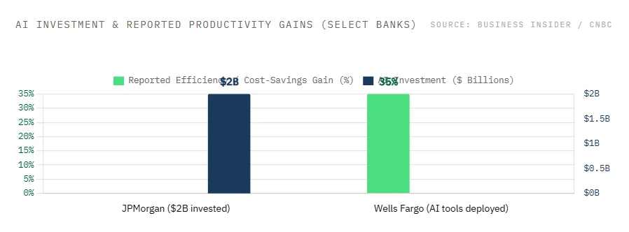 AI is reshaping bank economics. JPMorgan’s $2B AI investment has already paid off in cost savings. Wells Fargo reports 35% productivity gains in select areas.