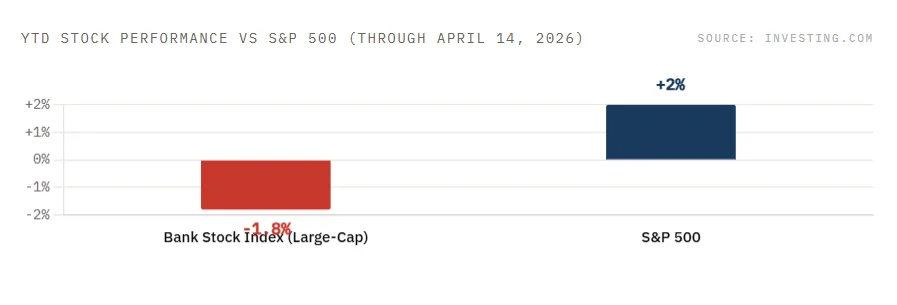 Bank stocks have underperformed the S&P 500 year-to-date (−1.8% vs +2%), signalling that investors are not yet fully pricing in the earnings beat.