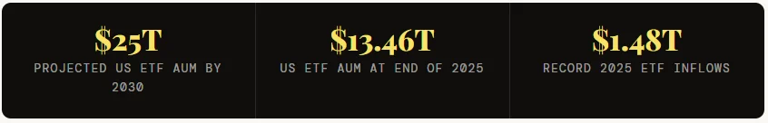 Record 2025: US ETFs closed last year at $13.46T, a 30% gain on $1.48T in record inflows.
