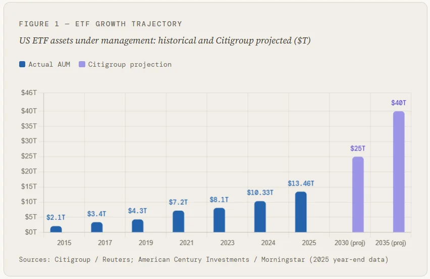 Citi also raised its 2035 target. The bank now expects US ETF assets to exceed $40 trillion by then. Its earlier forecast had set a $29 trillion ceiling for 2035. These are aggressive revisions, and the data justifies them.