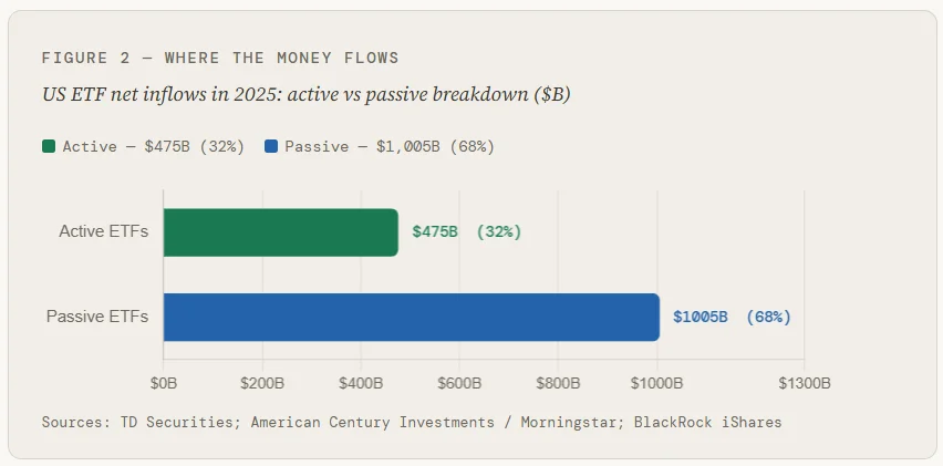 Active ETFs rising fast: They captured 32% of 2025 flows despite holding just 11% of total AUM.