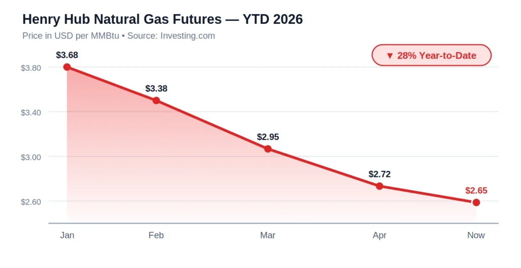 Henry Hub down 28% YTD, with futures near $2.65/MMBtu amid a mild winter exit.