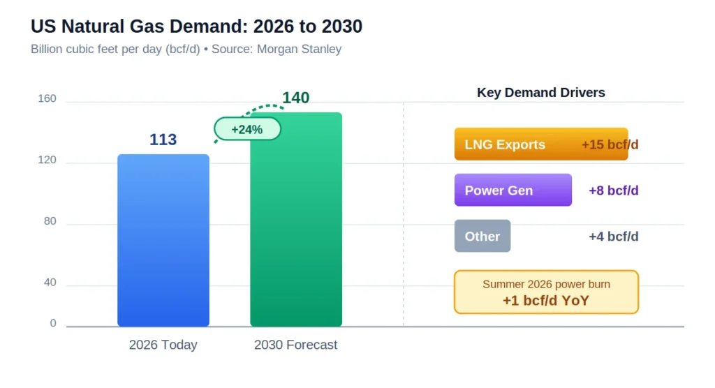 Morgan Stanley’s bullish case rests on one number. US gas demand is projected to climb to roughly 140 billion cubic feet per day (bcf/d) by 2030. Today it sits near 113 bcf/d, in line with EIA Short-Term Energy Outlook consumption baselines.